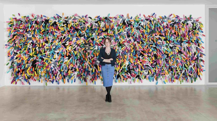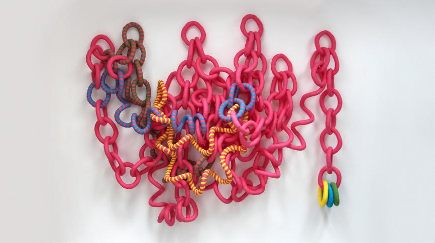 Ray offers an artistic practice that is highly accessible and appealing to the public, while also pioneering within the field of art textiles and soft sculpture. Her assemblages are full of joy and life; their palette bright and varied; their form and surface rich and highly tactile. In their fabrication, the artist has developed specialist techniques of stitching, wrapping and stuffing fabrics, which repeat and build in relation to each other – enabling new possibilities. Ray’s practice is a perpetual experimentation, she will have half a dozen artworks in development at any one time. She sees herself and the actions of her body as part of the work; building and dismantling component parts becomes a form of performance.