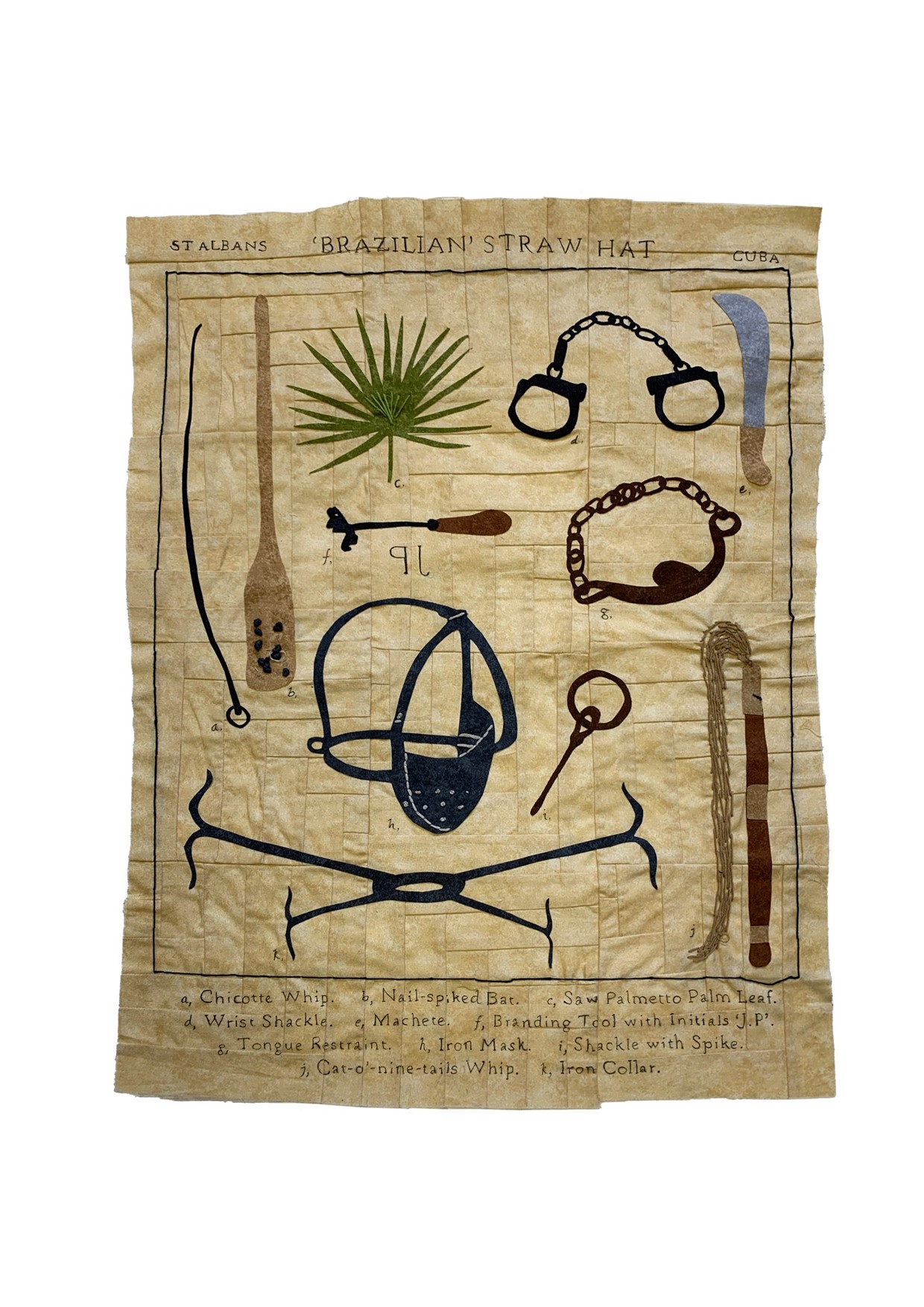 Jahnavi writes: This piece reveals the brutal violence, dehumanisation and exploitation that produced one of Hertfordshire's most treasured heritage objects - the St Albans 'Brazilian' Straw Hat. The harvesting and importation of raw palm leaves, like many other commodities produced in the Caribbean, rapidly developed Britain's 18th and 19th-century industrial era. Depicting brutal objects of punishment and torture enforced on enslaved Africans, this work speaks to one of the many unacknowledged legacies of the Transatlantic Trafficking of Enslaved Africans in Britain.