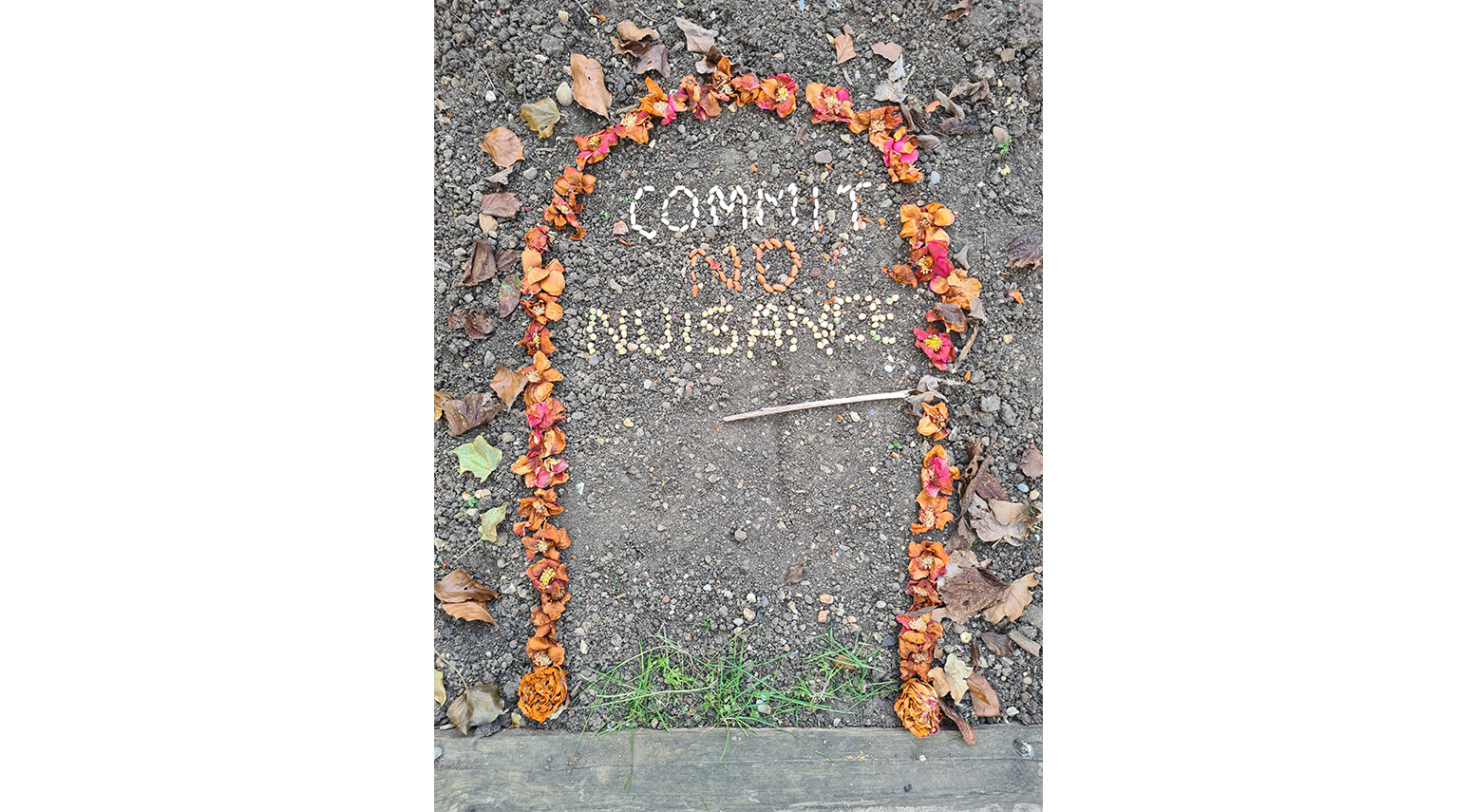 Medium: It is made of natural items from my garden, dried camelia flowers, leaves, a twig, grass and bean and pea seeds (the seeds were planted afterwards).