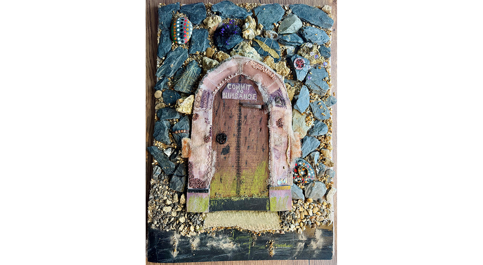 Framing the structure, the boundary walls are reproduced using printed imagery of the original stonework, enriched with intricate stitching and beadwork to reflect the tonal variations and textures of the stone arch. The rear wall is constructed from real stones, selected and arranged to echo the rugged charm of the actual setting. These surfaces are further enhanced with mixed media and decorative details, showcasing my personal artistic style.