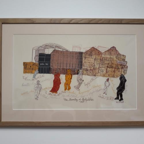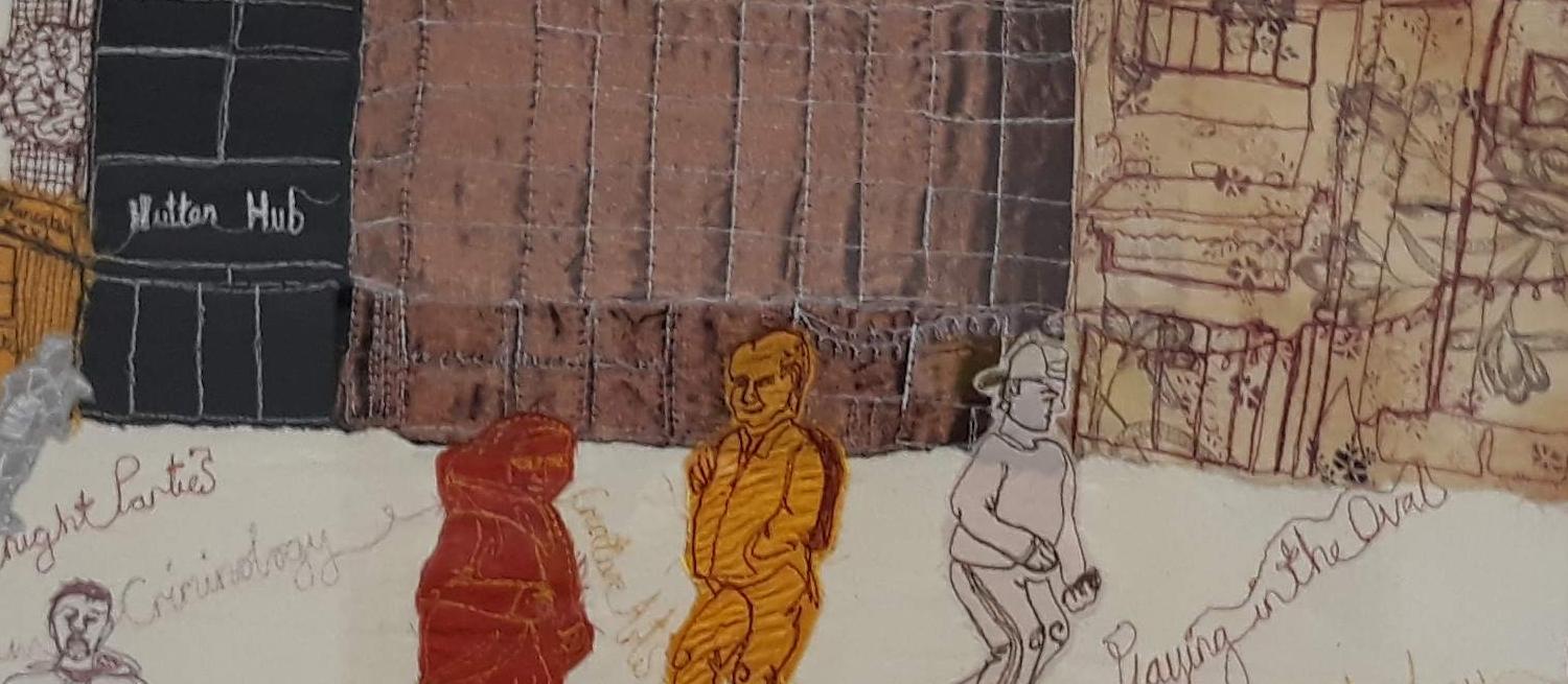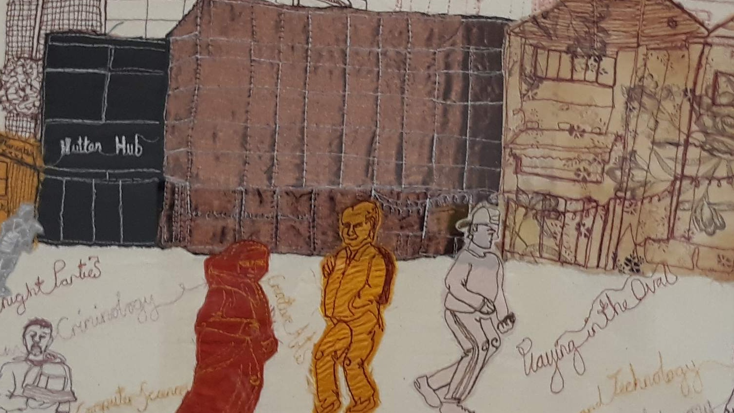 This textile is one of 6 created by Harriet Riddell during a residency at the University of Hertfordshire. Over a week, the artist captured daily life on campus and at sites across Hatfield on her bicycle-powered sewing machine. The artist invited passers-by to pedal and power her sewing machine to create delicate line drawings of the people, conversations and architecture around her.
