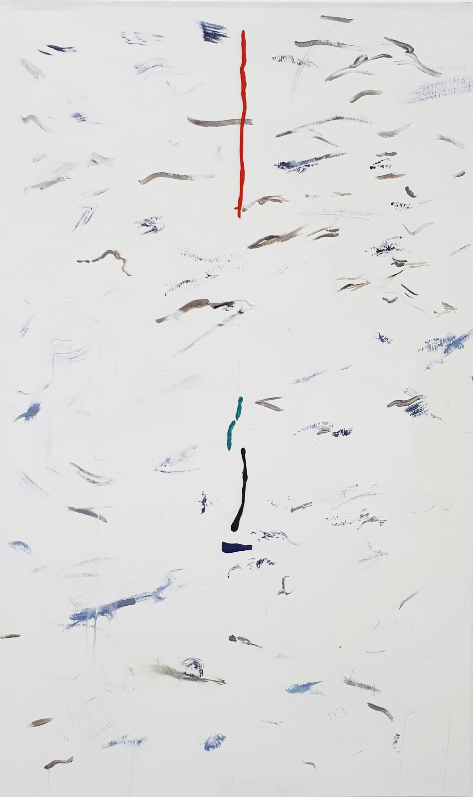 Finger Lickin’ Chicken Hypnotism is inspired by the phenomenon in which a chicken will become hypnotised if you place it in front of a straight line. The painting recalls a moment the artist exhaustedly stared down the length of his table, the objects fading in and out of sight as if in a dream-like state.