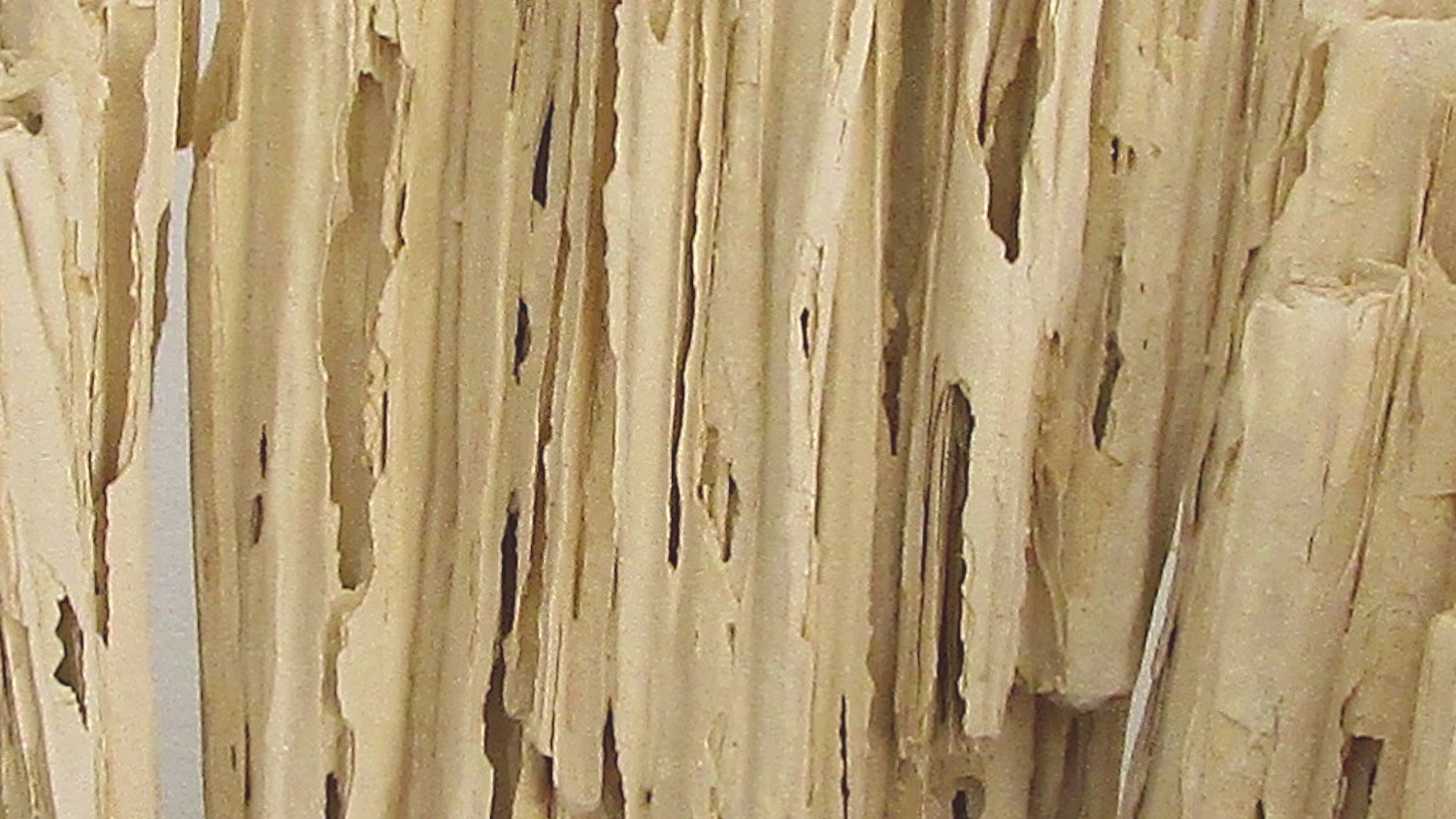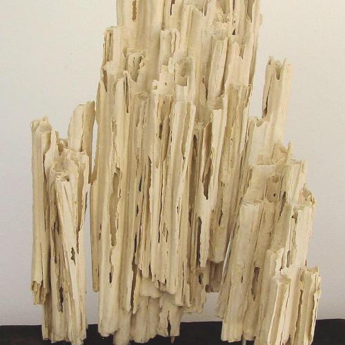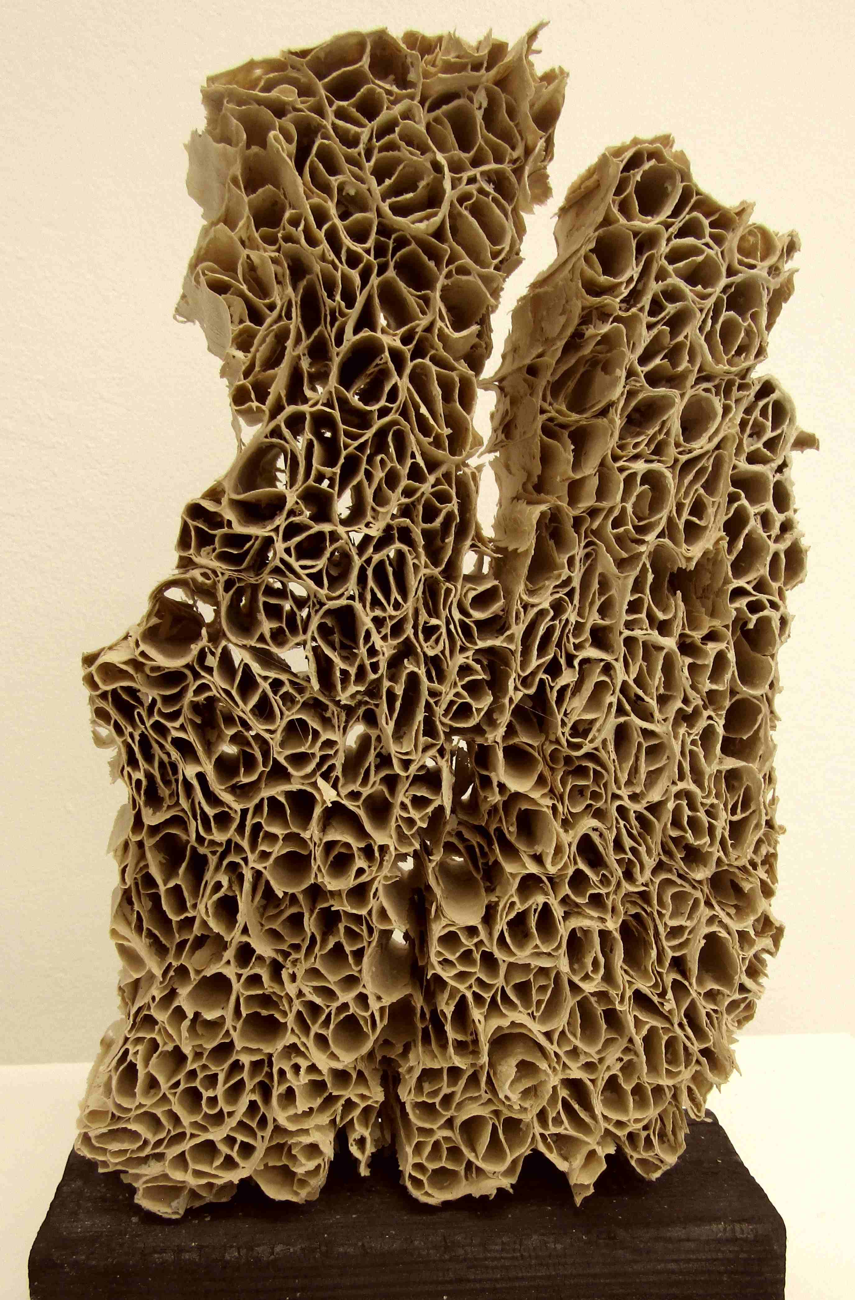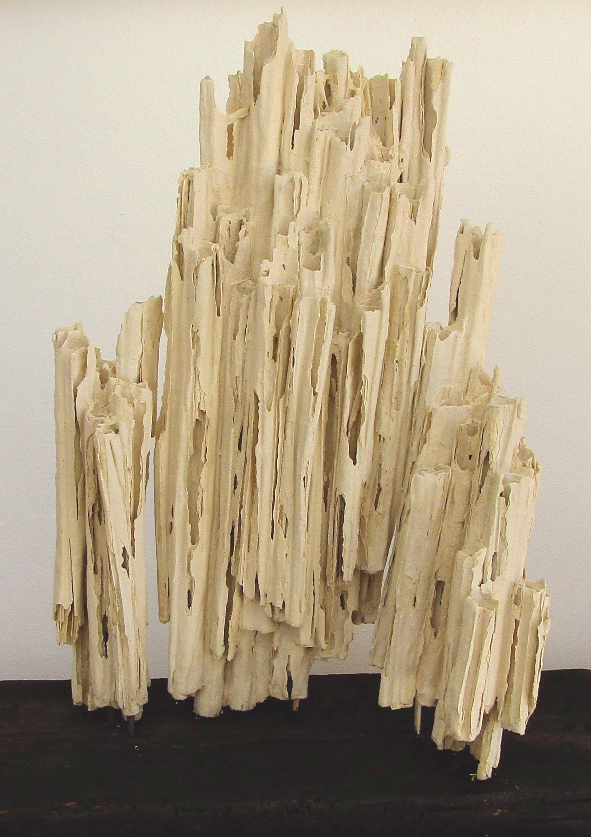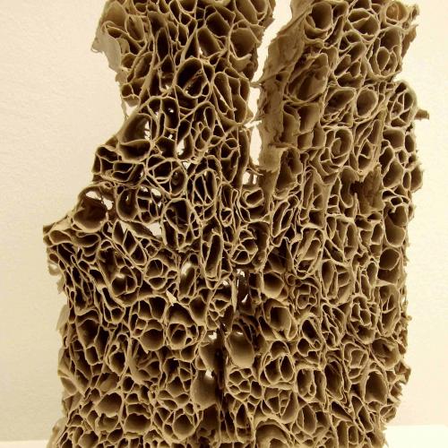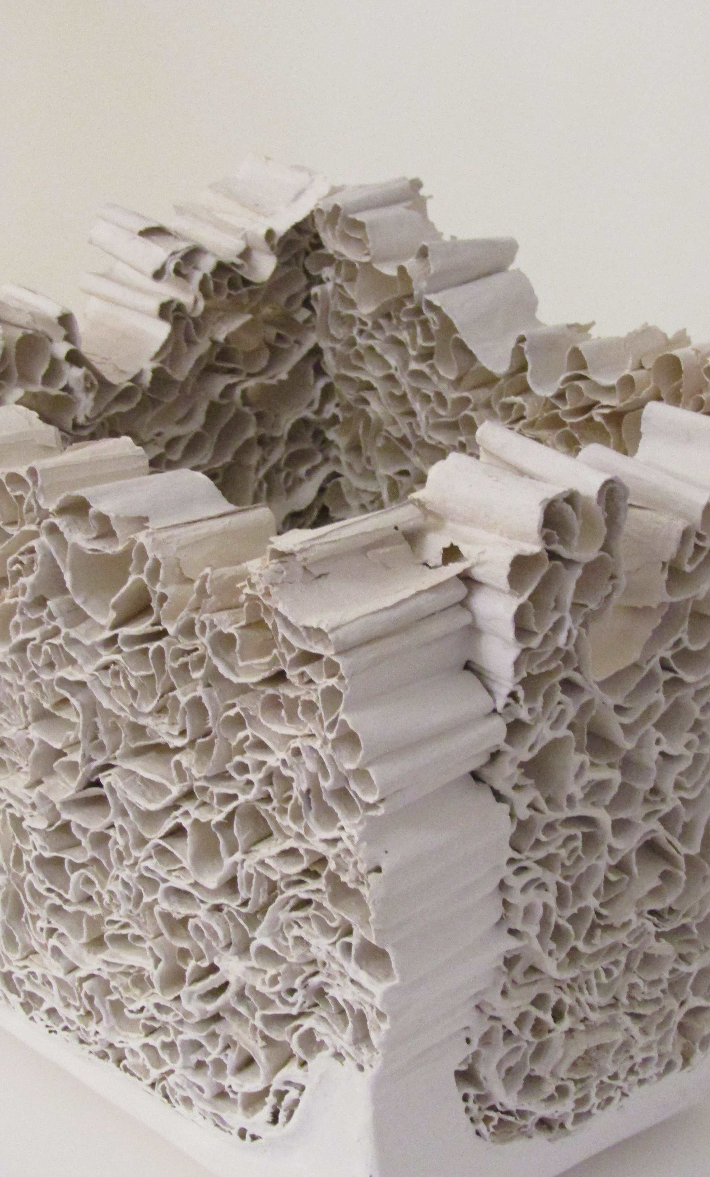 Julie Leaming works with charcoal, paper and clay to produce drawings and ceramic sculptures which examine landscapes and living organisms – exposing their structures and detailed networks eroded in their surface.