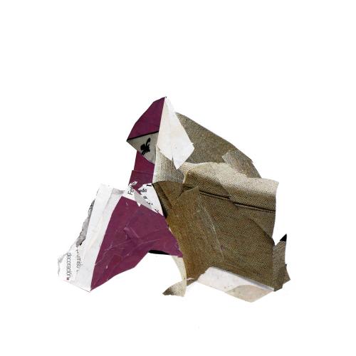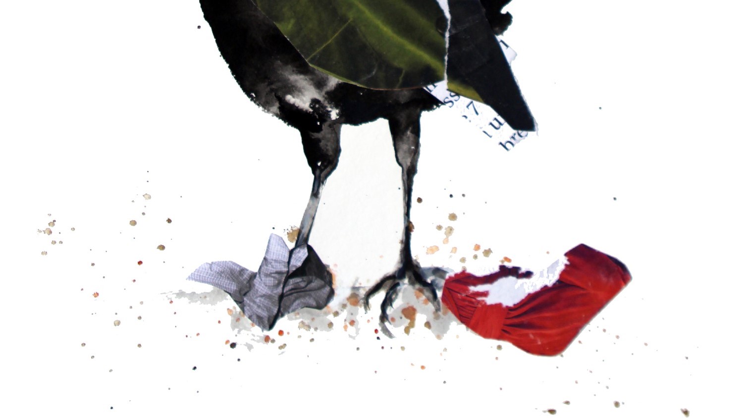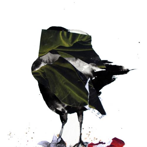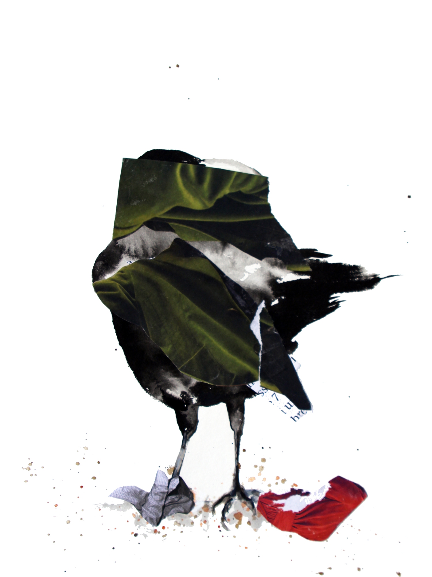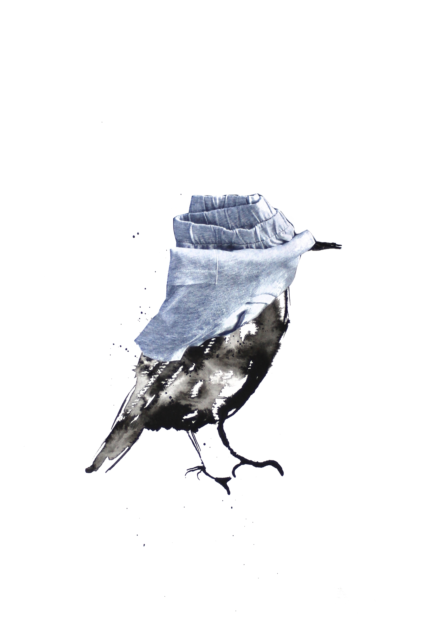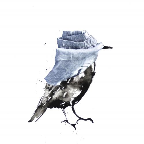 In Crow and Starling V, the artist evokes the relationship between society and animals – using images of clothing as a symbolic material to cover the head and body of the bird. Scrunched-up Paper is inspired by Cubist artworks and explores three dimensionalities within the two-dimensional plane.