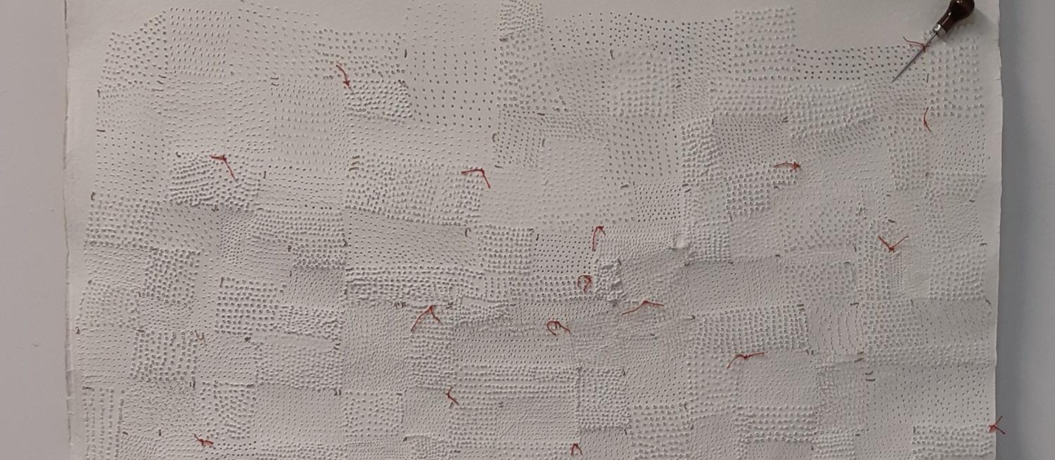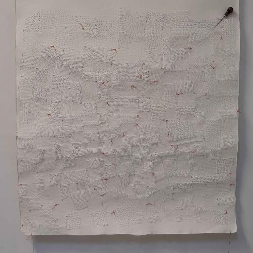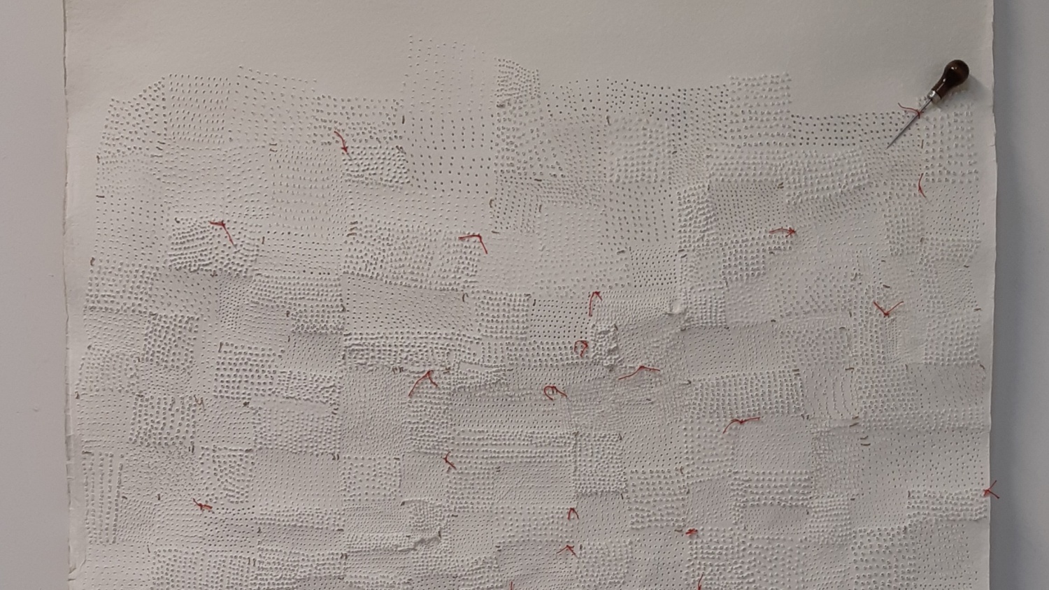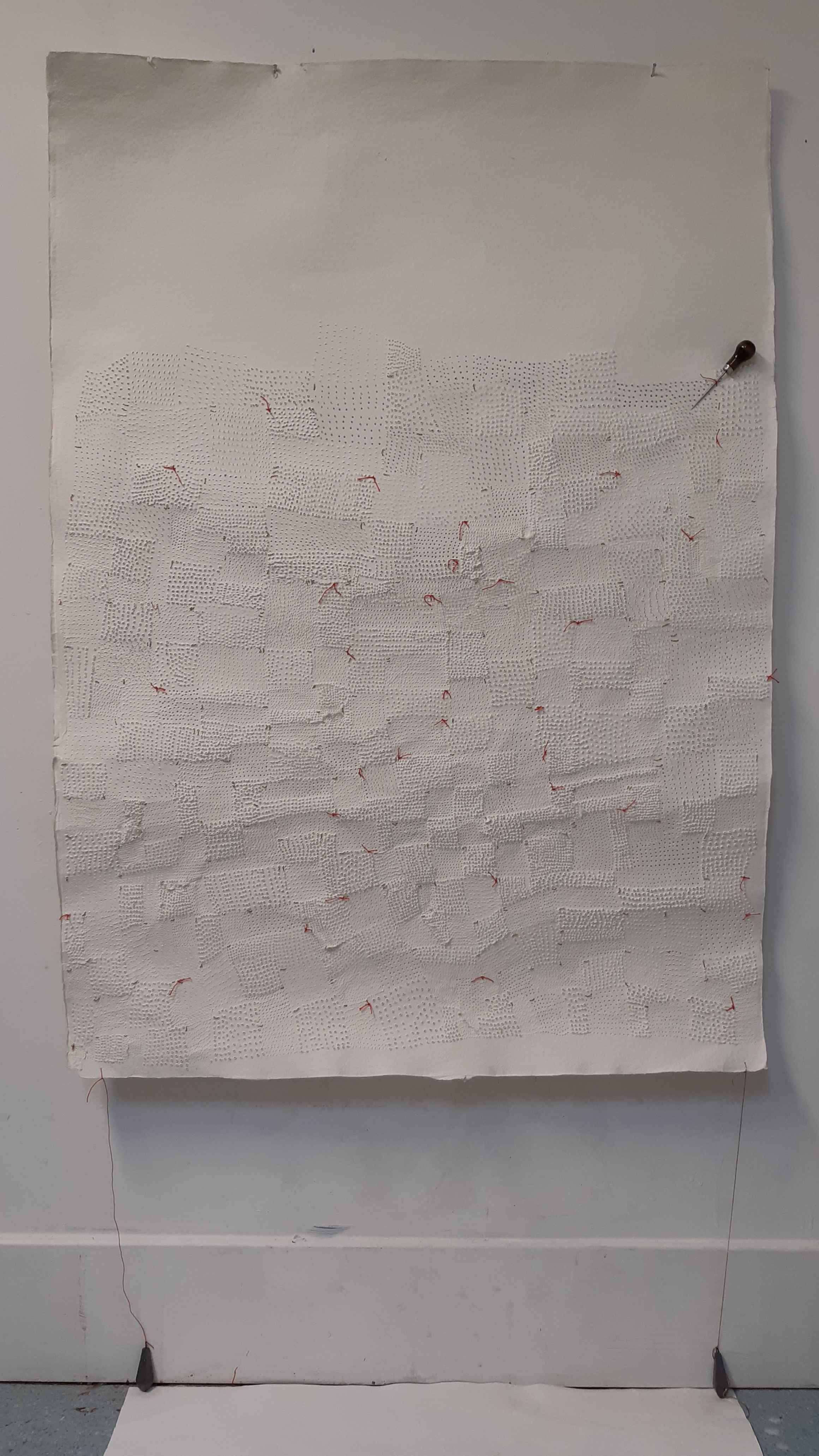 Counted acknowledges migrants who have perished trying to reach sanctuary. Gold stitches symbolise each 100 and red each 1000. The Khadi paper reflects the artists own Indian heritage where her personal history of migration starts.
