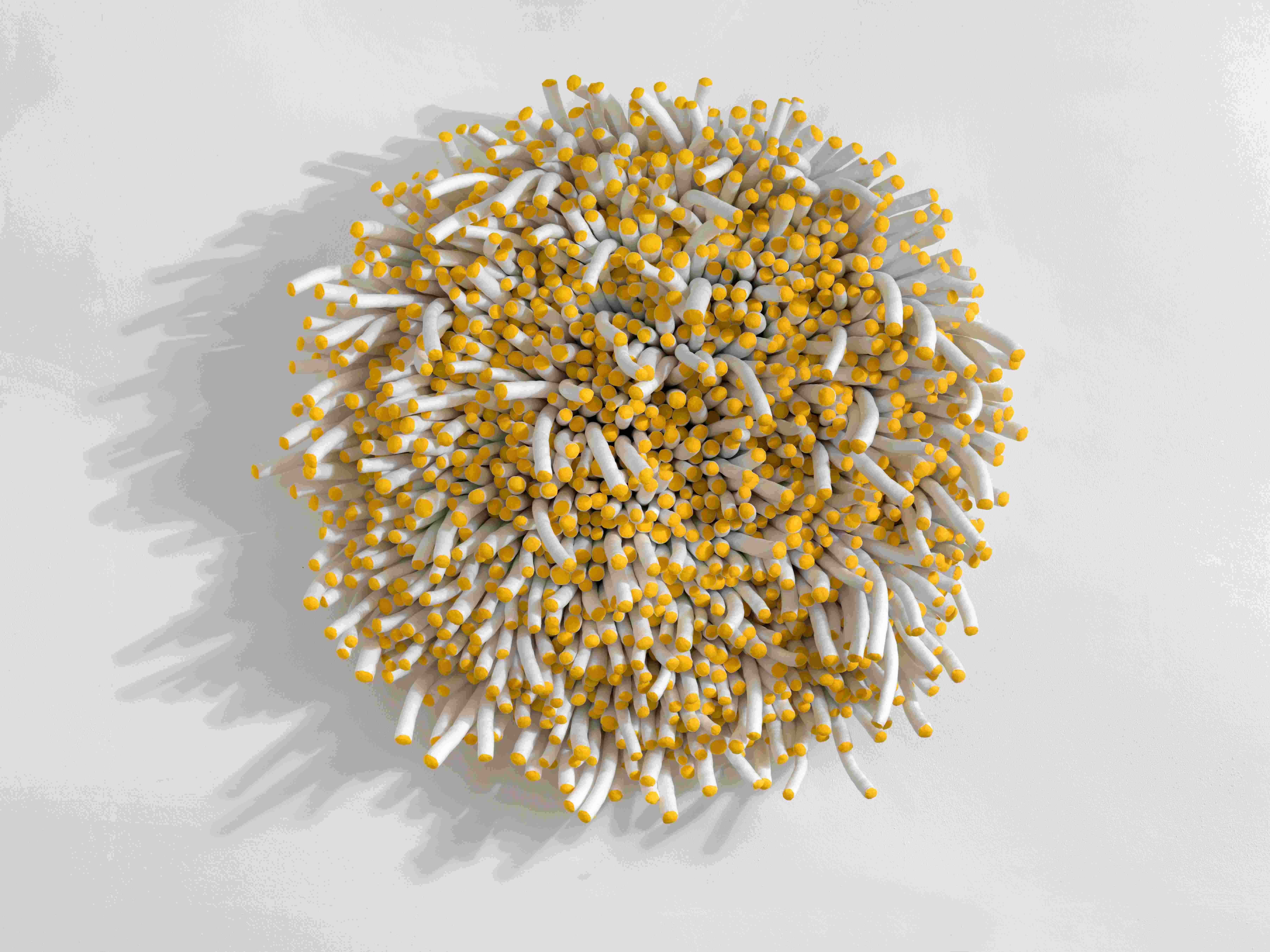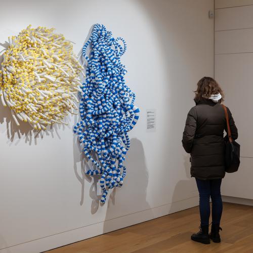Working from a studio in Hertfordshire, Anna Ray has an impressive international commissioning and exhibition record with her stitched artwork. ‘Fibre and Form’ focused on large-scale sculptural pieces created over the past 20 years. It featured two newly commissioned sculptures entitled Mesh and Rosette, which had been fabricated during the pandemic, supported using public funding by the National Lottery through Arts Council England. The exhibition pivots on these ambitious new assemblages and Ray’s seminal wall piece Margate Knot, originally produced for the exhibition ‘Entangled: Threads & Making’, Turner Contemporary (2017).