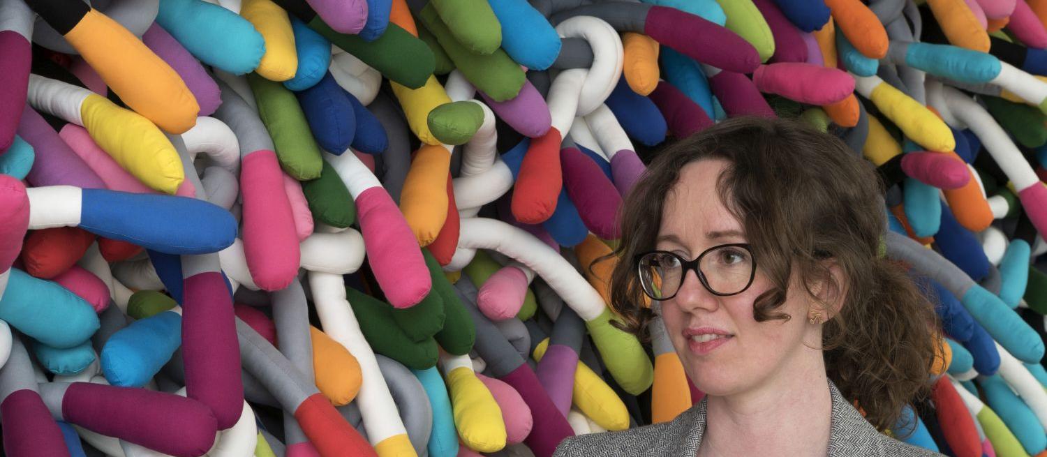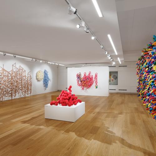 Ray offers an artistic practice that is highly accessible and appealing to the public, while also pioneering within the field of art textiles and soft sculpture. Her assemblages are full of joy and life; their palette bright and varied; their form and surface rich and highly tactile. In their fabrication, the artist has developed specialist techniques of stitching, wrapping and stuffing fabrics, which repeat and build in relation to each other – enabling new possibilities. Ray’s practice is a perpetual experimentation, she will have half a dozen artworks in development at any one time. She sees herself and the actions of her body as part of the work; building and dismantling component parts becomes a form of performance.
