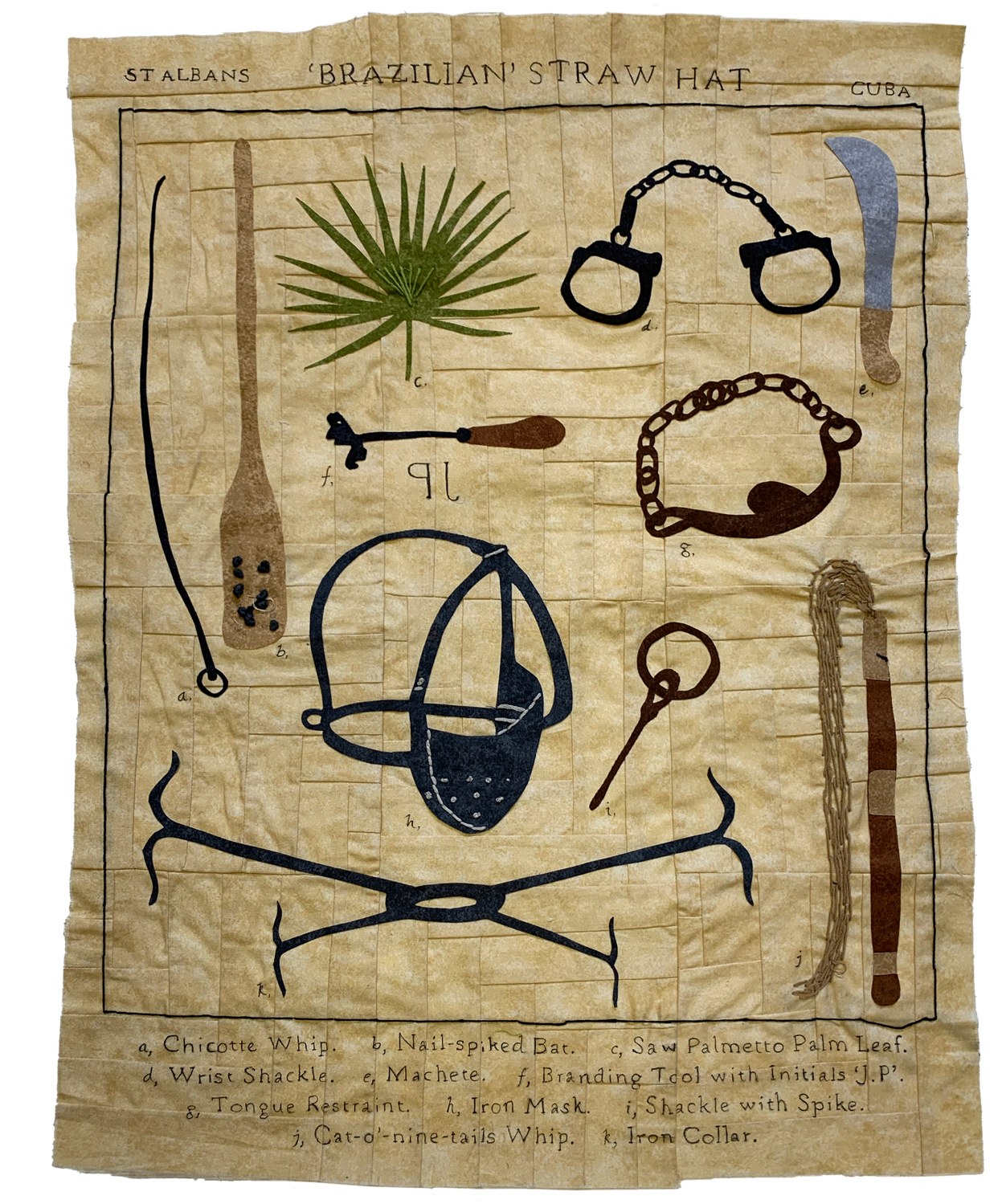 “This piece reveals the brutal violence, dehumanisation and exploitation that produced one of Hertfordshire's most treasured heritage objects - the St Albans 'Brazilian' Straw Hat. The harvesting and importation of raw palm leaves, like many other commodities produced in the Caribbean, rapidly developed Britain's 18th and 19th-century industrial era. Depicting brutal objects of punishment and torture enforced on enslaved Africans, this work speaks to one of the many unacknowledged legacies of the Transatlantic Trafficking of Enslaved Africans in Britain.”
