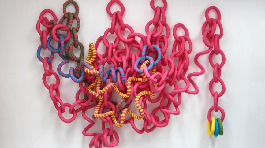 Ray offers an artistic practice that is highly accessible and appealing to the public, while also pioneering within the field of art textiles and soft sculpture. Her assemblages are full of joy and life; their palette bright and varied; their form and surface rich and highly tactile. In their fabrication, the artist has developed specialist techniques of stitching, wrapping and stuffing fabrics, which repeat and build in relation to each other – enabling new possibilities. Ray’s practice is a perpetual experimentation, she will have half a dozen artworks in development at any one time. She sees herself and the actions of her body as part of the work; building and dismantling component parts becomes a form of performance.