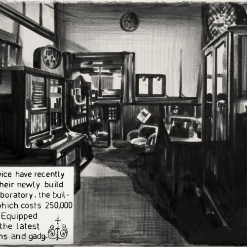 Amongst his series of 28 film noir style drawings in the exhibition, van Eeden focused on two events in St Albans history. The first of which centred around a Post Office radio station near St Albans which was used to secretly intercept German wireless traffic from 1932, the earliest of its kind in Britain. The second concerns a more gruesome account: the murder of “Red Max” Kassel.