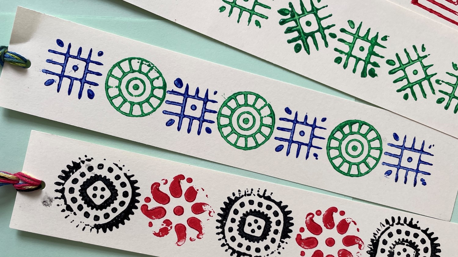 Take inspiration from the geometric patterns seen in Worlds Connected and use woodblocks to design and print your own set of bookmarks.